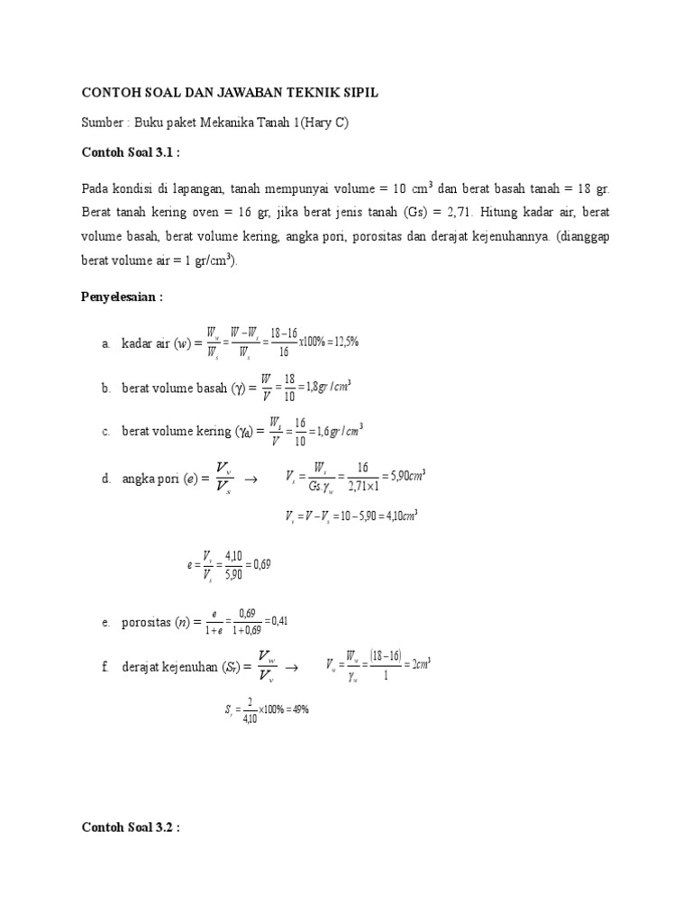 Berat tanah kering oven = 16 gr, jika berat jenis tanah (gs) = 2,71. Buku paket mekanika tanah 1(hary c) contoh soal 3.1 : Contoh soal cpns yang kami sajikan disini tidak hanya contoh soal dan kunci jawabannya saja, namun lengkap dengan pembahasannya. Pada kondisi di lapangan, tanah mempunyai volume = 10 cm3 dan berat basah tanah = 18 gr. Pada kondisi di lapangan, tanah mempunyai volume = 10 cm3 dan berat basah tanah = 18 gr.